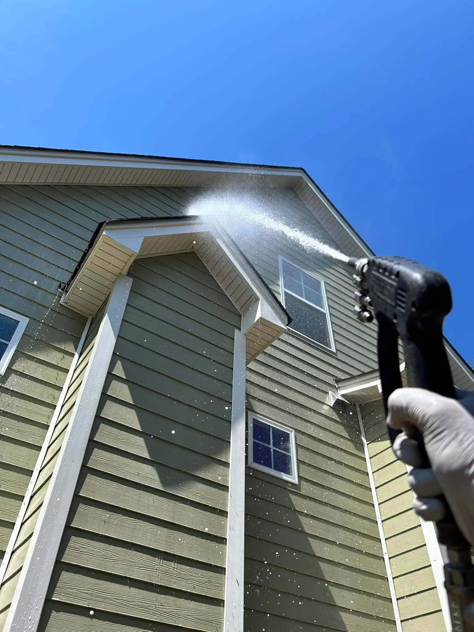 That’s our estimated price for a two‑story property suitable for soft washing. The exterior may require ladder or roof access to reach upper areas, allowing us to remove built‑up dirt, algae, moss, and general weathering for a thorough clean.